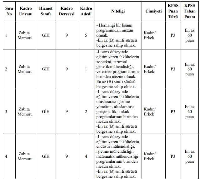 Yayımlanan resmi ilana göre; Alanya Belediyesi kadrolarında 657 sayılı Devlet Memurları Kanunu’na tabi olarak görevlendirilmek üzere, Belediye Zabıta Yönetmeliği hükümleri çerçevesinde toplam 20 zabıta memuru istihdam edilecektir. Adayların; unvan, sınıf, derece ve nitelik bazında belirtilen özel şartları taşımaları kaydıyla, boş kadrolara açıktan atama yoluyla yerleştirmeleri yapılacaktır.