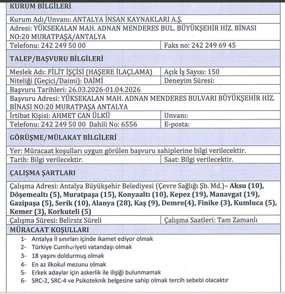 İŞKUR üzerinden yayınlanan ilanda Antalya Büyükşehir Belediyesi iştirak şirketlerinden birisi olan Antalya İnsan Kaynakları A.Ş. kendi bünyesinde istihdam etmek üzere mezuniyet şartsız (bazı kadrolarda değişiklik gösterebilir) Fitil İşçisi (Haşere İlaçlama), Temizlik İşçisi, Tır Şoförü, Benden İşçisi unvanlarında toplam da 259 daimi işçi, personel alımı yapılacağına yer verilmiştir.