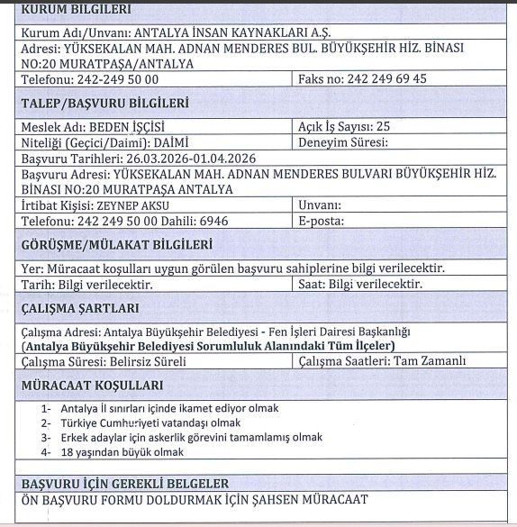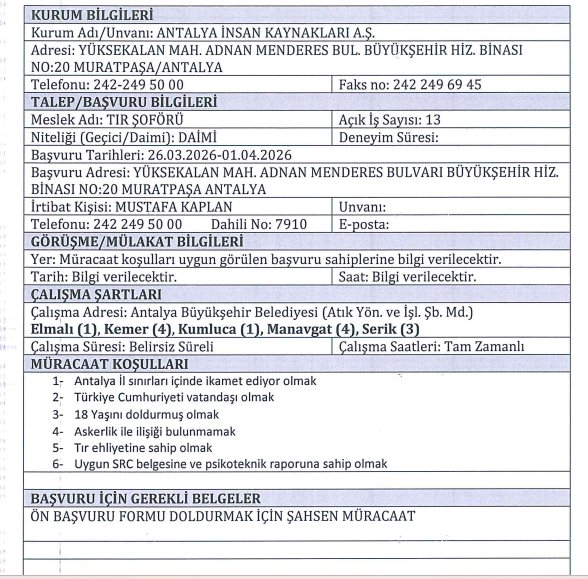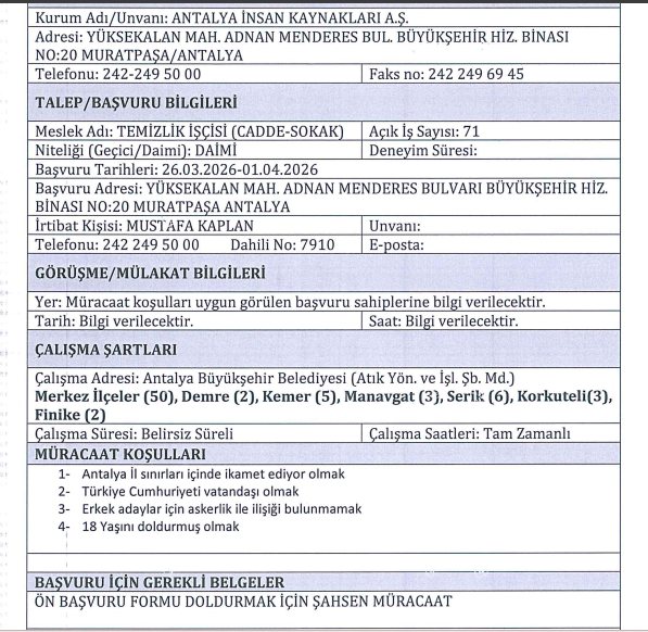 Antalya Büyükşehir Belediyesi işçi, personel alımı için yukarıda yer alan iş başvuru şartlarını taşıyan adayların 6.03.2026-01.04.2026 tarihleri arasında Yüksekalan Mahallesi, Adnan Menderes Bulvarı, Büyükşehir Hizmet Binası No: 20, Muratpaşa / Antalya adresine başvurularını yapmaları gerekmektedir.