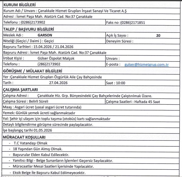 İŞKUR üzerinden yayınlanan ilgili iş ilanında Çanakkale Belediyesi iştirak şirketi bahsi geçen iştirak şirketi bünyesinde istihdam etmek üzere Garson, Güvenlik Görevlisi, Cankurtaran, Temizlik Görevlisi, Ocakçı, Otopark Görevlisi (Vale), Kasiyer unvanlarında toplam 39 geçici süreli işçi ve personel alımı yapılacağına yer verilmiştir.