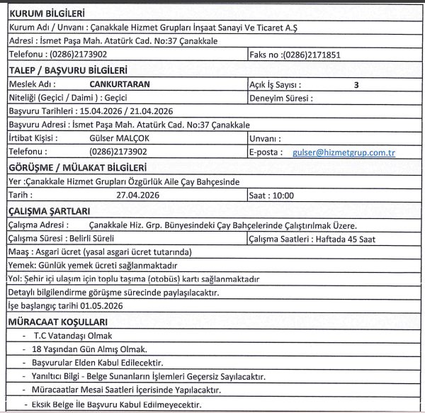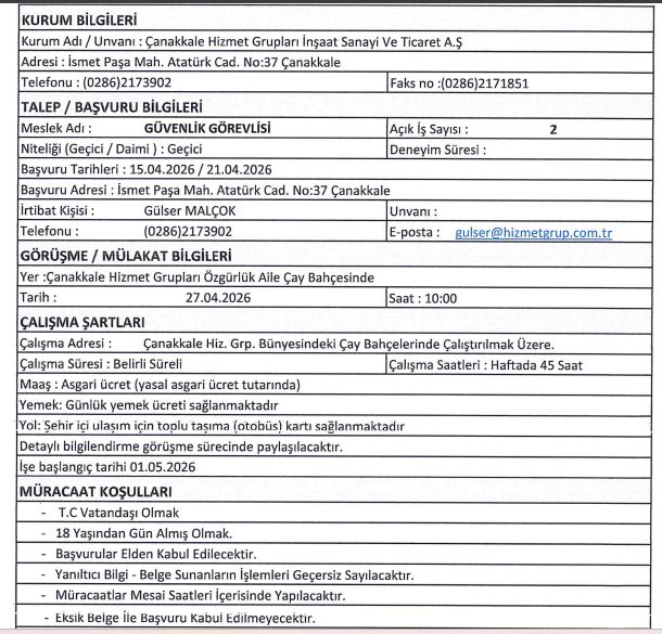 Çanakkale Belediyesi işçi ve personel alımı için yukarıda yer alan iş başvuru şartlarını taşıyan adayların 15.04.2026/21.04.2026 tarihleri arasında İsmet Paşa Mah. Atatürk Cad. No:37 Çanakkale adresine başvurularını yapmaları gerekmektedir.