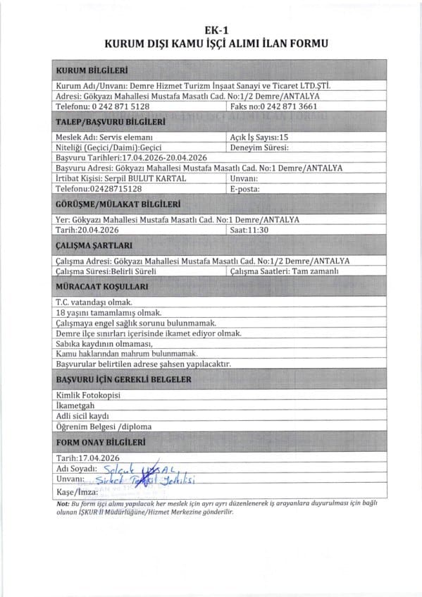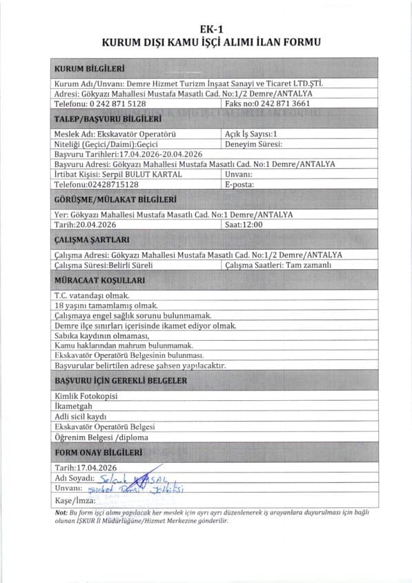 Antalya’nın Demre ilçesinde, Demre Hizmet Turizm İnşaat Sanayi ve Ticaret LTD. ŞTİ. bünyesinde istihdam edilmek üzere personel alımı yapılacağı duyuruldu. Yayımlanan ilanlara göre toplam 26 personel alınacak. Alım kapsamında 1 ekskavatör operatörü, 15 servis elemanı ve 10 mutfak görevlisi istihdam edilecek.