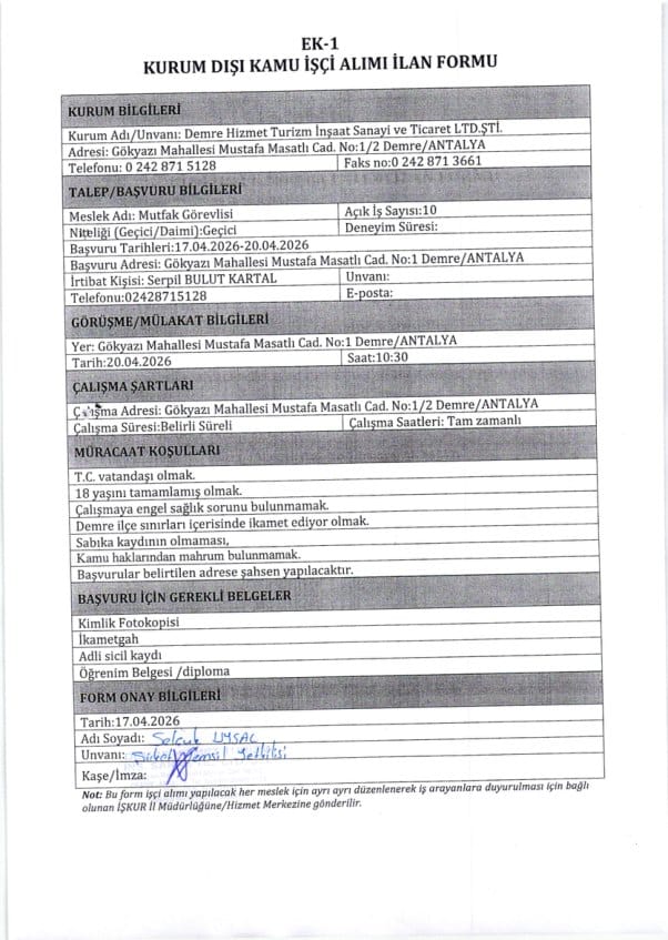 Başvurular 17 Nisan 2026 ile 20 Nisan 2026 tarihleri arasında şahsen yapılacak. Adayların başvurularını Gökyazı Mahallesi Mustafa Masatlı Caddesi No:1 Demre / Antalya adresine teslim etmeleri gerekiyor.
