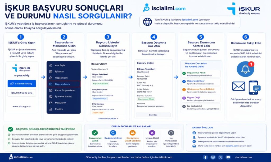 İŞKUR başvuru sonuçları nereden öğrenilir? Başvuru sonuçlarını e-Devlet üzerindeki “İş Başvurusu Sorgulama” hizmetinden veya İŞKUR e-Şube’deki “Başvurularım” sekmesinden anlık olarak takip edebilirsiniz.