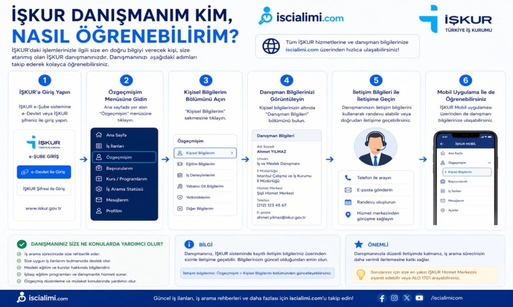 İŞKUR sisteminde kayıtlı kullanıcılar için danışman bilgisi, yalnızca bilgilendirici bir detay değil; iş arama sürecini daha doğru yönetebilmek açısından önemli bir destek noktasıdır. İŞKUR e-Şube giriş ekranında hem iş arayanlar hem de işverenler için “Danışmanım Kim?” bağlantısının ayrı ayrı sunulması, danışmanlık hizmetinin sistem içinde aktif olarak kullanıldığını gösterir. İŞKUR’un iş ve meslek danışmanlığı sayfalarında da iş arayanlara ve işverenlere yönelik danışmanlık hizmetleri verildiği açıkça belirtilmektedir.
