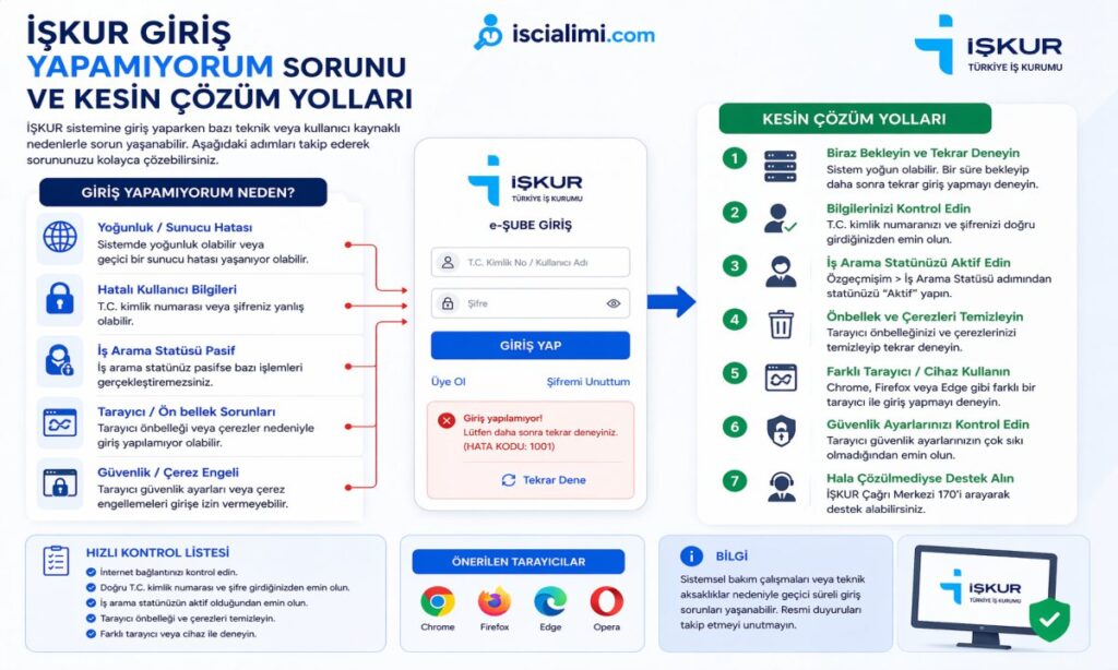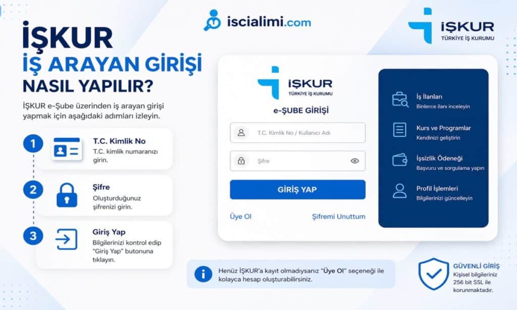 Bu rehberde, İŞKUR giriş işlemini en güncel haliyle adım adım ve hızlı şekilde nasıl yapabileceğinizi detaylı olarak ele alıyoruz; e-Devlet üzerinden girişten iş arayan ve işveren panellerine erişime kadar tüm süreci açık ve anlaşılır şekilde açıklıyoruz. Ayrıca “İŞKUR’a giremiyorum”, “şifremi unuttum” veya “üyelik oluşturamıyorum” gibi en sık karşılaşılan sorunların kesin çözümlerini de bu içerikte bulabilirsiniz. Amacımız, sizi doğrudan doğru giriş ekranına yönlendirerek tüm işlemlerinizi en kısa sürede ve sorunsuz şekilde tamamlamanızı sağlamaktır.