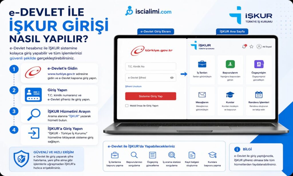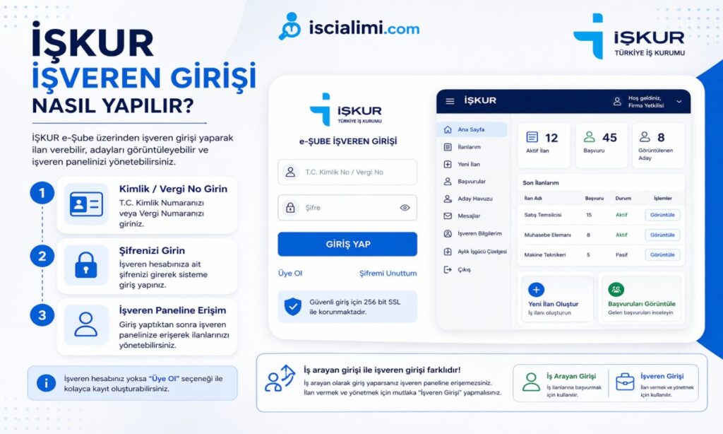 İŞKUR işveren işlemleri yalnızca e-Şube ile sınırlı değildir. e-Devlet üzerinde de Türkiye İş Kurumu İşveren İşlemleri adlı ayrı bir hizmet yer alır. Bu nedenle bazı kullanıcılar, özellikle kimlik doğrulaması ve resmi kamu hizmetlerine erişim tarafında e-Devlet üzerinden yönlendirme ile karşılaşabilir. Ancak işveren paneli kullanımı, ilan yönetimi ve üyelik akışı açısından ana giriş noktası yine İŞKUR e-Şube ekranıdır.