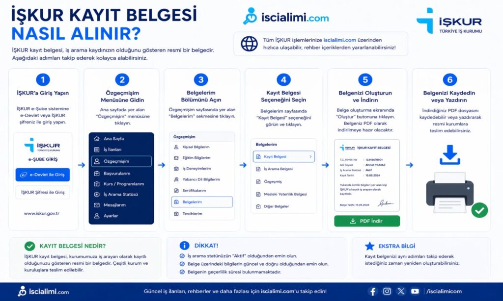 İŞKUR üzerinden işlem yaparken en çok ihtiyaç duyulan belgelerden biri kayıt belgesidir. Belgenin nasıl alınacağını adım adım öğrenmek için İŞKUR kayıt belgesi alma rehberimizi inceleyebilirsiniz.