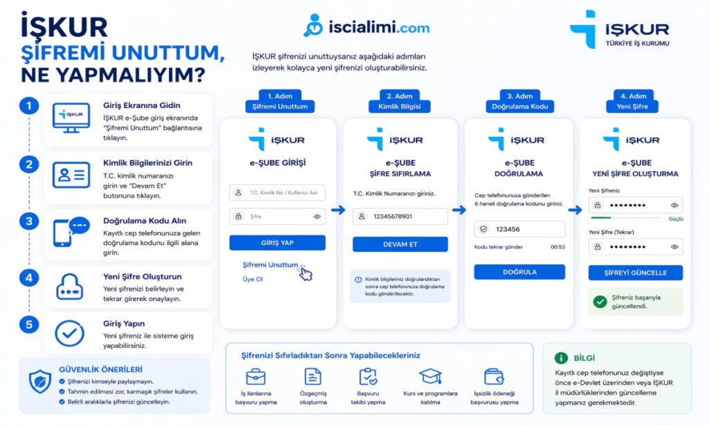 • Yeni şifrenizi belirleyin: Kimlik doğrulaması tamamlandıktan sonra yeni bir şifre oluşturabilir ve mevcut hesabınızla yeniden giriş yapabilirsiniz. İŞKUR’un resmi SSS açıklamasında bu akış açıkça tarif edilmektedir.