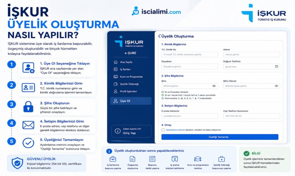 İş arayanlar için kayıt süreci İŞKUR e-Şube üzerindeki “Üye Ol” seçeneğiyle başlar. 2026 güncel kayıt standartlarında süreç şu şekilde ilerler: