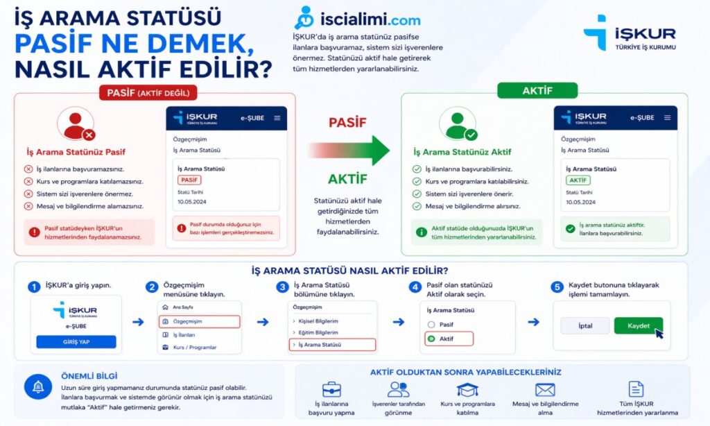 İŞKUR sisteminde iş arama statüsünün pasif olması, hesabınıza giriş yapabiliyor olsanız bile iş arayan olarak aktif değerlendirilmediğiniz anlamına gelir. Bu durumda sistem üzerinde bazı hizmetler görünse de, uygun iş ilanları, kurslar, programlar ve diğer İŞKUR hizmetlerinden tam olarak yararlanmanız mümkün olmayabilir. İŞKUR e-Şube ana sayfasında da, iş arama statüsü pasif olan kullanıcıların bu hizmetlerden faydalanabilmesi için kayıtlarını aktife alması gerektiği açıkça belirtilmektedir.
