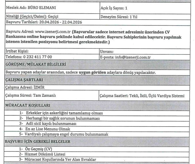 Online başvurular 20.04.2026-22.04.2026 tarihleri arasında www.izenerji.com.tr adresindeki CV Bankası üzerinden yapılacak. Şahsen başvuru yapılması gereken kadrolar için ise süreç 20.04.2026 – 24.04.2026 tarihleri arasında İsmet Kaptan Mahallesi, Hürriyet Bulvarı, Münir Birsel Plaza, B Blok, No: 18, K: 4 İnsan Kaynakları Müdürlüğü – Konak/İZMİR adresinde yürütülecek.