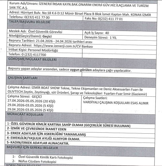 Özel güvenlik görevlisi alımı için başvurular 21.04.2026 – 24.04.2026 tarihleri arasında https://www.izenerji.com.tr/ CV Bankası üzerinden alınacak.