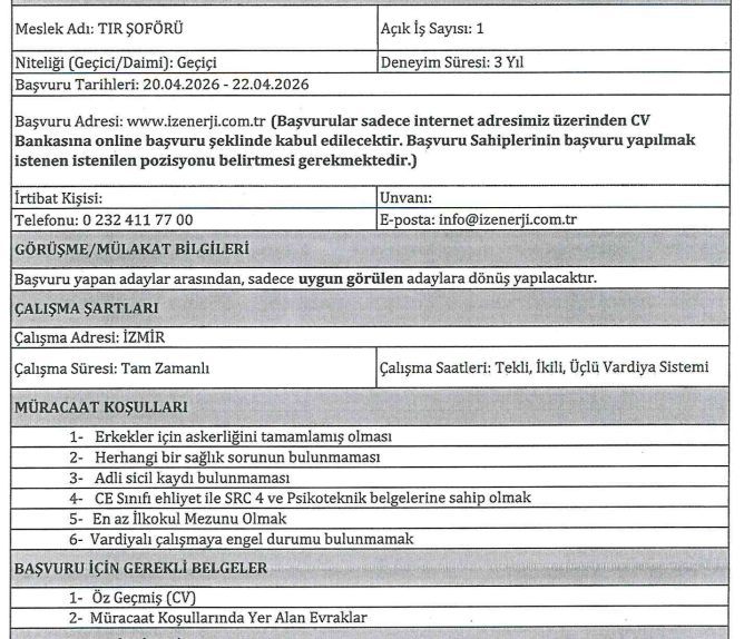 İzmir Büyükşehir Belediyesi İZENERJİ Tır Şoförü Alımı İlan Belgesi 2026