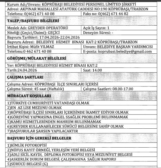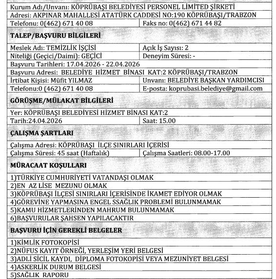Trabzon iline bağlı Köprübaşı Belediyesi, bünyesinde görevlendirmek üzere farklı kadrolarda toplam 3 adet geçici işçi alımı yapacağını duyurdu. Köprübaşı Belediyesi Personel Limited Şirketi üzerinden gerçekleştirilecek olan alımlarda, adayların belirli şartları taşıması ve başvurularını şahsen iletmesi gerekiyor.