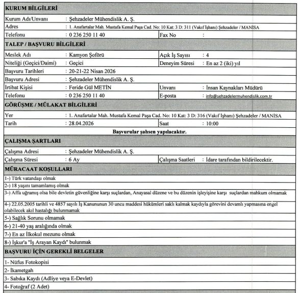 Manisa Şehzadeler Belediyesi iştiraklerinden olan Şehzadeler Mühendislik A.Ş., personel kadrosunu güçlendirmek amacıyla kamyon şoförü alımı yapacağını duyurdu. 6 ay süreli geçici istihdam kapsamında yapılacak olan bu alımda, adayların belirli bir deneyim süresine ve ikamet şartlarına sahip olması bekleniyor.