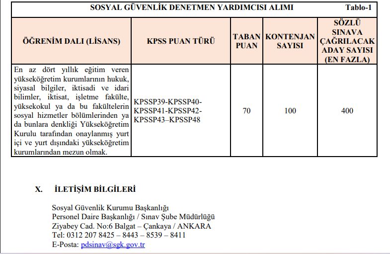 Başvuru şartları arasında KPSS puan kriteri, yaş sınırı ve eğitim şartı gibi önemli detaylar yer alırken, adayların belirtilen nitelikleri eksiksiz şekilde taşıması gerekiyor. İşte SGK denetmen yardımcısı alımına ilişkin merak edilen tüm detaylar…