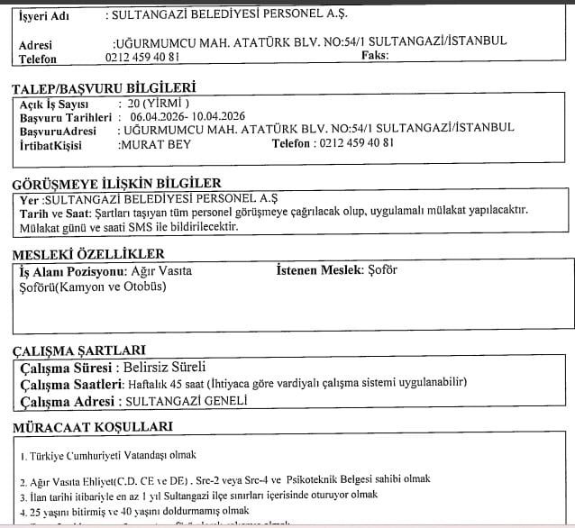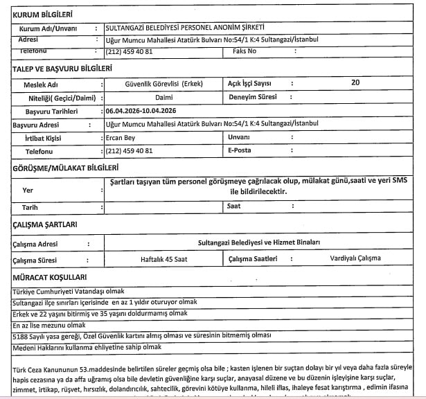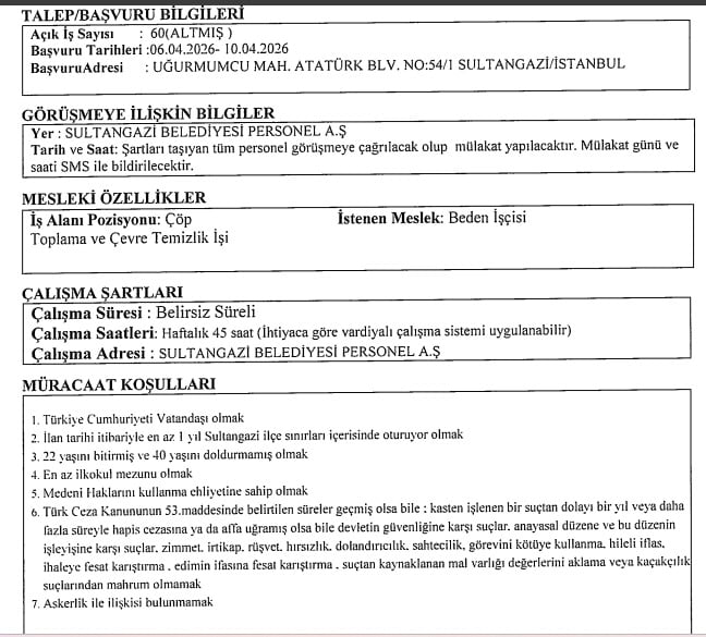 Sultangazi Belediyesi işçi, personel alımı için yukarıda yer alan iş başvuru şartlarını taşıyan adayların 06.04.2026 – 10.04.2026 tarihleri arasında Uğur Mumcu Mahallesi Atatürk Bulvarı No:54/1 Sultangazi / İstanbul adresine başvurularını yapmaları gerekmektedir.
