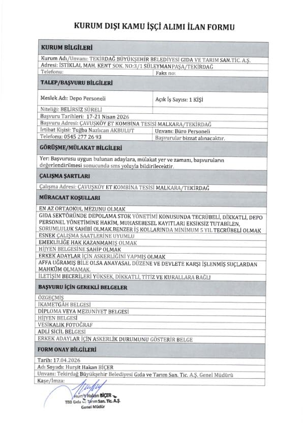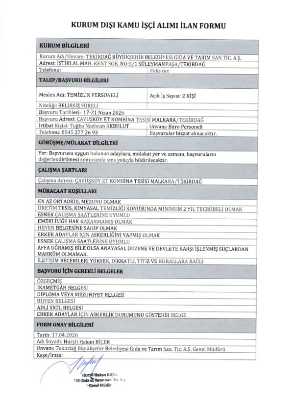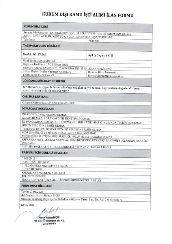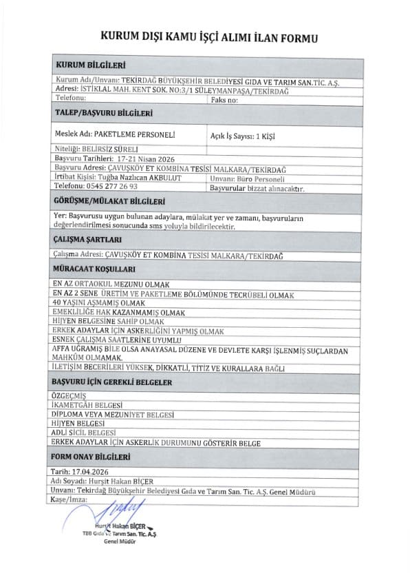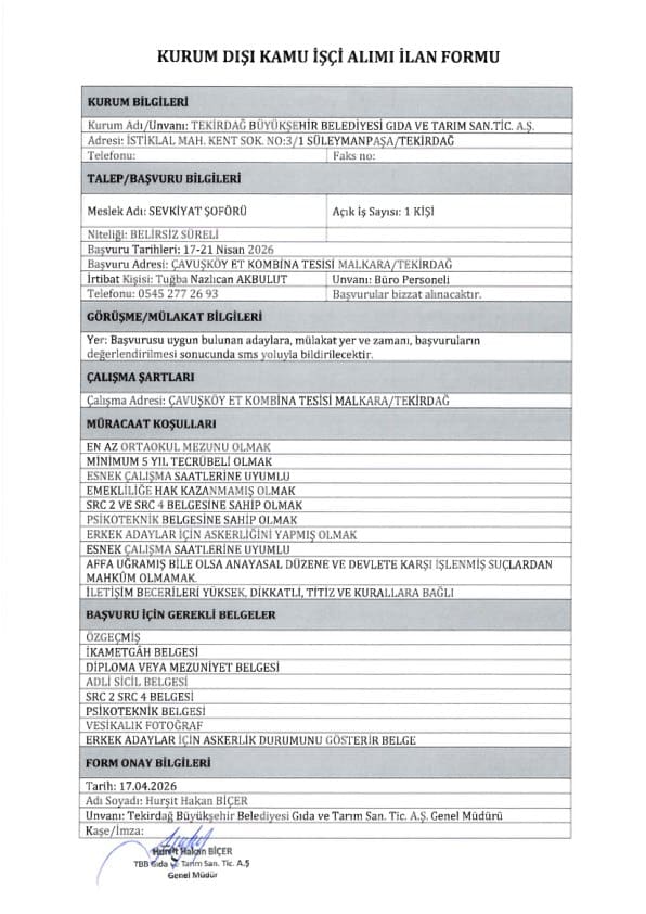 Tekirdağ Büyükşehir Belediyesi işçi ve personel alımı için yazımızda yer vermiş olduğumuz başvuru şartlarını taşıyan adayların 17.04.2026 – 21.04.2026 tarihleri arasında Çavuşköy Et Kombina Tesisi, Malkara / Tekirdağ adresine başvurularını yapmaları gerekmektedir.