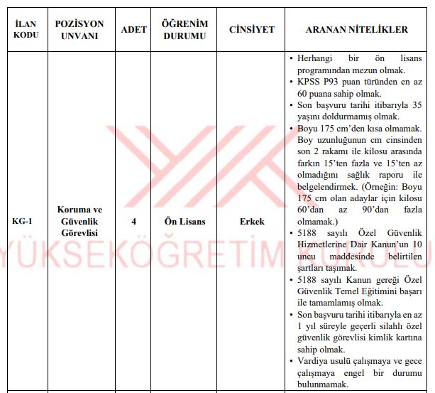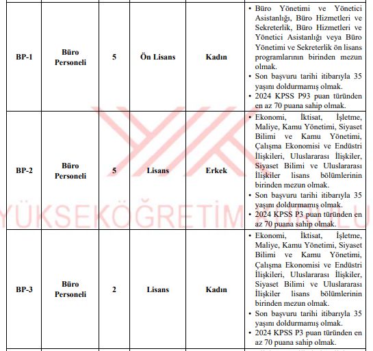 Yükseköğretim Kurulu bünyesinde istihdam edilecek personeller için branşlar netleşti. YÖK 35 sözleşmeli personel kadro dağılımı listesinde; 17 büro personeli, 4 koruma ve güvenlik görevlisi, 5 destek personeli, 3 teknisyen, 1 avukat ve 2 şoför kadrosu yer alıyor.