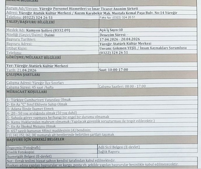 İŞKUR üzerinden yayınlanan ilanda Yüreğir Belediyesi iştirak şirketi Yüreğir Personel Hizmetleri ve İmar Ticaret Anonim Şirketi kendi bünyesinde istihdam etmek üzere en az ilkokul mezunu olma şartı ile Kamyon Şoförü unvanında toplam 10 daimi işçi alımı yapılacağını duyurdu.